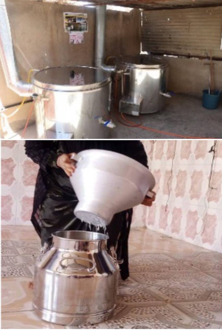 مكونات المشروع | تم تجهيز مربيات الثروة الحيوانية في محافظة كربلاء المقدسة ب (فلتر حليب , دلو بلاستك كبير وصغير ,دبة نقل حليب 40 لتر و20 لتر , وعاء غلي حليب ,مشعل غاز وقنينة , طاولة , خميرة , خضاضة كهربائية , حلابة , براد وجاروشة وجهاز بسترة ) |